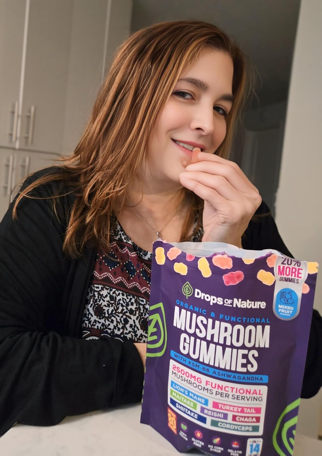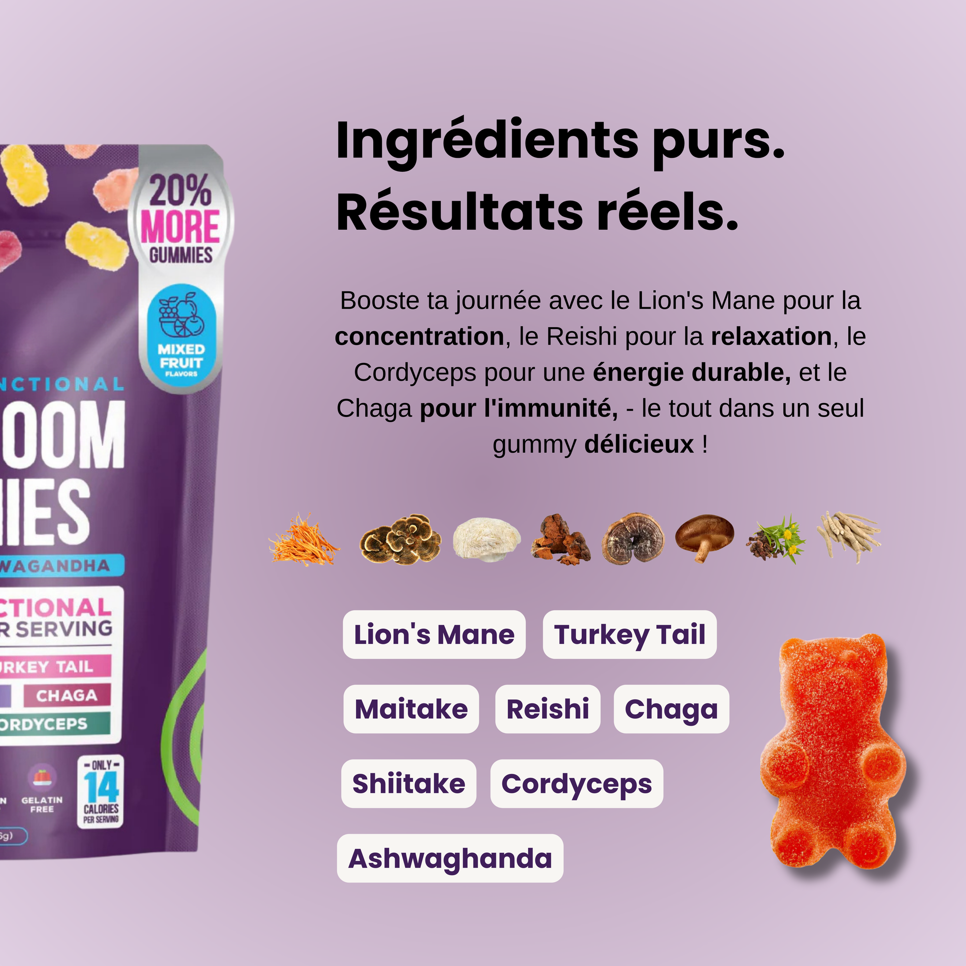 Chaque gummy contient 7 champignons puissants (Chaga, Maitake, Turkey Tail, Shiitake, Reishi, Cordyceps, Lion's Mane) + de l'Ashwagandha pour un cocktail de bienfaits naturels.