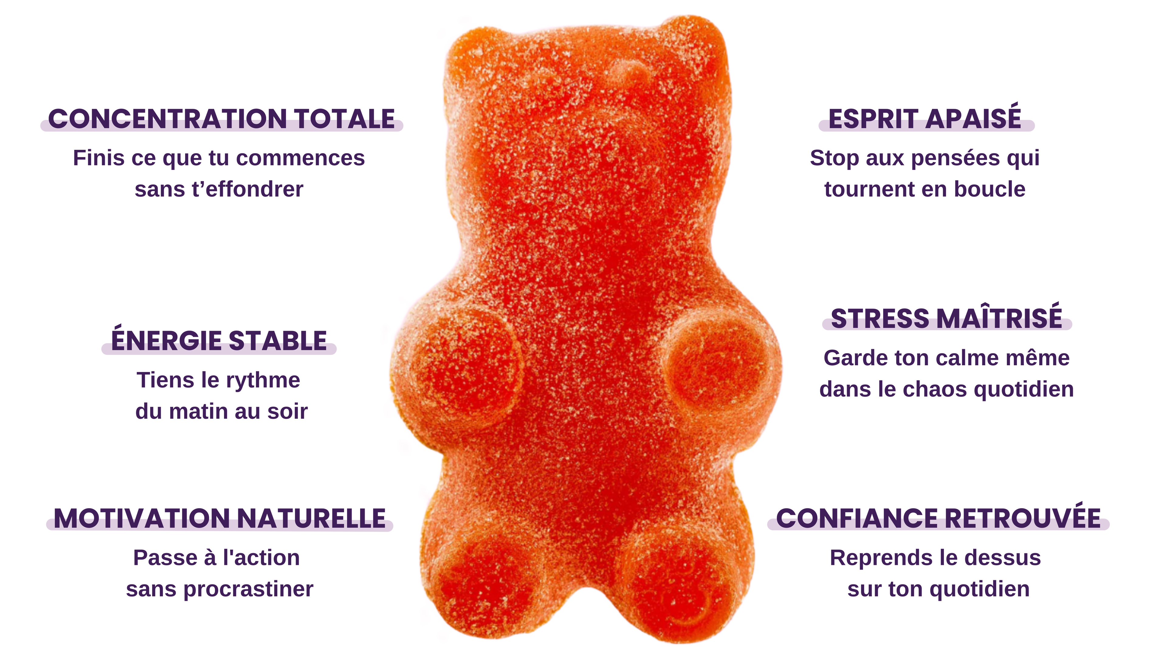 Tu peux t'attendre à une meilleure concentration, plus d'énergie stable, moins de stress, et un sentiment général d'être plus à la hauteur de tes journées chargées.