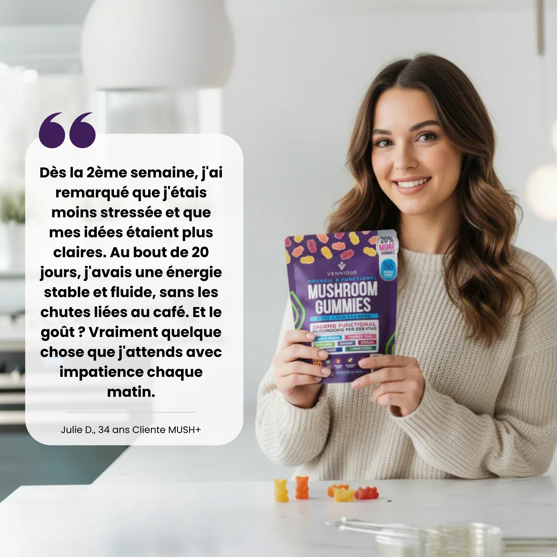 7 champignons puissants + ashwagandha de qualité premium, testés pour leur pureté. 9 femmes sur 10 retrouvent leur énergie et leur sérénité dès la première semaine.